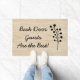 This cute doormat features a rustic look, linen burlap background and a modern black flourish that looks a bit like branches with circular leaves. The mat says "Back Door Guests are the Best" in black text, and is a great way to welcome your close and familiar family and friends who automatically just go to your back door!