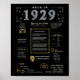 This BACK IN 1929 digital poster is filled with fun facts, news, and highlights of what happened years ago. With faux gold and silver accents on a black background, distinctive icons, and bold typography, the digital poster exudes a timeless, stylish look. It serves as a memorable conversation piece at birthday parties and anniversaries, and when framed, it becomes a thoughtful keepsake gift, adding a touch of nostalgia to any space. Delight your beloved with our Back in 1929 printable poster, a memorable present brimming with nostalgia and individuality. Bursting with captivating details, it offers a personalised voyage through history, making it an ideal selection for marking a cherished birthday occasion. The photo is a printable poster for the year 1929 that includes information such as average income per year, popular baby names, historical events like the 18th Amendment and the Stock Market Crash, inventions of the time, fashion trends like Flapper Dresses and Cloche Hats, slang terms, and average costs of items like a pound of bread and a gallon of gas.