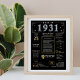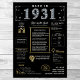 Embark on a journey back to 1931 with our captivating digital poster, brimming with historical facts, news highlights, and intriguing titbits from bygone years. Enhanced with faux gold and silver accents set against a striking black backdrop, adorned with distinctive icons and bold typography, this poster radiates timeless elegance. Whether igniting conversations at birthday parties or anniversaries, or when tastefully framed, it evolves into a cherished keepsake, suffusing any space with a nostalgic allure.