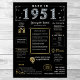 Step into 1951 with our engaging digital birthday poster, filled with historical facts, important events, and interesting stories from the past. Decorated with classy gold and silver details on a bold black background, featuring unique symbols and stylish text, this birthday poster has a timeless charm. Whether sparking conversations at birthday gatherings or kept as a keepsake, it brings back nostalgic memories.
