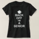 In the style of the popular British "Keep Calm and Carry On" posters, this t-shirt design for high school students in their senior year says, "Back Off I'm a Senior" with the silhouette of a graduation mortarboard. If you're in the senior class, this shirt will be funny to wear to warn the underclassmen of your cool, upperclassman status. Wear it with senior pride!