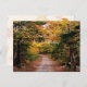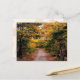 Fall wedding save the date postcards. Scenic back road photography taken in New England shows a tree lined path through the woods with spectacular yellow and orange foliage. Customise using the template text, in dark green, on reverse. Lines are provided for adding addresses.