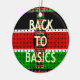 The design features the flag's colours—black, red, and green—in a brick-like, textured pattern, giving the piece a tactile, handmade feel. The iconic Maasai shield and spears are centred over the flag, while the bold, simple yellow text "BACK TO BASICS" emphasises the importance of culture, unity, and national foundation. The entire motif is framed by a decorative border of miniature Kenyan flags, completing this proud, patriotic look.