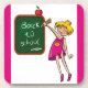 GIRL WRITING "BACK TO SCHOOL" ON THE CHALKBOARD, WITH AN APPLE FOR THE TEACHER