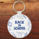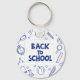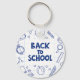Carry a cheerful reminder of school with this keychain featuring a bold, handwritten-style “BACK TO SCHOOL” text block framed by hand-drawn doodle icons of school essentials. Dark blue icons include a backpack, pencil, ruler, paper aeroplane, alarm clock, open book, beaker, apple, basketball, magnifying glass, and paint palette on a white grid background. Perfect for students, teachers, and classroom use.