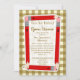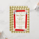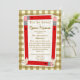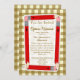 An invitation featuring a brown gingham background on front and back. Front features red pencils arranged in a rectangle shape with sheer white centre. Personalise with teacher's name, grade, location, and date of your back to school open house orientation.