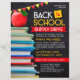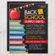 Back to school supply drive fundraiser flyer features a range of colourful stacked books, a red apple and a red and yellow polka dot banner on a chalkboard background.