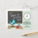 This back to school postcard features a graphic of a wall clock and chalkboard with the text: It's Back to School Time! The postcard is accented with a globe sitting on books, a red apple and a container full of pencils. Customisable text allows you to add your name, grade and school.