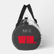 The coolest Duffle Bag with "life is a GAME, play to WIN." logo throughout. abstract keyboard print on one side. end of bag with logo "play to win."