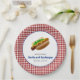 Add this personalised paper plate to your next backyard cookout. The design offers a large graphic of a hot dog and is accented with a red checked border. Custom text allows you to add your name and date.