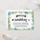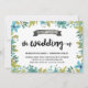 This pretty, backyard garden theme wedding invitation features a beautiful blue and green floral wreath border, pretty brush script calligraphy, and a rustic chic chalkboard banner.