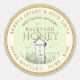 Central design features an illustration of a small backyard hive on a pale green background. HONEY is written in a chiseled metallic gold font. Text is printed in gold. Textured kraft border. Personalise with your apiary name, address and honey description (raw, hand bottled, single source etc.). Also include your honey net weight. Common honey net weight conversions: 8oz (227g), 12oz (340g), 16oz (454g), 32oz (907g), 5lb (2.27kg).