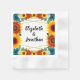 Elegant and colourful floral design for a backyard summer event. Features teal blue roses, white daisies, red wildflowers and sunflowers with gold geometric frame