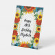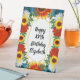 Elegant and colourful floral design for a backyard summer event. Features teal blue roses, white daisies, red wildflowers and sunflowers with gold geometric frame