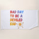 This playful and humorous design features the phrase "BAD DAY TO BE A DEVILED EGG" rendered in a bold, distressed, rainbow-gradient font. Below the text, a delightful cartoon fried egg character with outstretched arms and a wide-eyed, slightly panicked expression perfectly illustrates the pun. It’s a witty graphic, ideal for those who appreciate food-related jokes, clever wordplay, and unique, eye-catching apparel or decor. Perfect for breakfast enthusiasts, culinary humor collectors, or anyone who enjoys a good laugh.