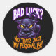 An ultra-grumpy-style cartoon black cat radiating pure bad-luck energy and savage attitude. With glowing yellow eyes, crossed paws, and a tail curled like a cursed question mark, this sarcastic feline declares: “Bad Luck? No, That’s Just My Personality!”