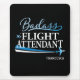 Badass Flight Attendant Personalised Black Mouse Pad. This sharp looking design features a "Badass" flowing blue gradient script over the white, serif-font words "Flight Attendant". The silhouette of a plane swooshes under the wording with trails of matching blue and white. This simple, yet elegant design is a gorgeous personalised gift for your flight attendant friends!