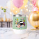 A cute black and white badger sitting amongst wild flowers and mushrooms in a a backdrop of sage green