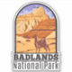 Badlands vector artwork design. The park’s dramatic landscapes span layered rock formations, steep canyons and towering spires. Bison, bighorn sheep and prairie dogs inhabit its sprawling grasslands.