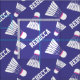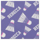 Badminton racquet sport repeat personalised shuttlecock pattern sporting design fabric. White shuttles with a pink band on a purple blue background colour which can be changed if required. Ideal for badminton fans. Customise with your own choice of name, currently reads Rebecca. Art and designed by Sarah Trett.
