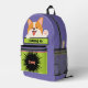 This adorable Bag Buddy backpack has a funny and cute waving dog that looks a bit like a Corgi and is perfect for any child or adult that likes a little fun. Purple background features a sweet waving puppy holding a sign that tells the world who he belongs to, and the design is accented with dog paws and a bone sticking out of one of the side pockets. Personalised with a name or initials on the teal front pocket, and perfect for books, school, toys, clothes, sports gear, travel, or anything that needs to be carried. This fun and playful custom design is a part of the 'Bag Buddy' series. Great gift idea for birthday, back-to-school, or any special occasion.