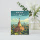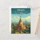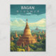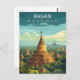 Explore the ancient wonder of the East with this beautiful Bagan Myanmar Travel Postcard. This vintage-style illustration captures the breathtaking landscape of thousands of golden pagodas and temples rising from the lush green plains.