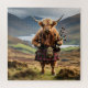 Pictured Dressed In A Kilt And Jacket In The Highlands Of Scotland, A Highland Cow Is Holding A Set Of Bagpipes. If You Would Like This Image In Black And White Go To Customize, Find The Filters Right Side In Designer, Then Click Black White Filter, Happy Designing.