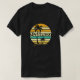 Retro sunset palette with palm silhouettes and a distressed texture, evoking a tropical island getaway. Ideal for vacation wear and island-inspired apparel.