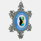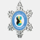 Blonde haired angel dressed in the flag of the Bahamas flies Inside of a white circle of squiggly squares on this pewter snowflake ornament. The background is blue squiggly squares. The white and blue colours were chosen to represent Hanukkah. Design created for families of multiple religions. Add a name to personalise. Add a year to customise. Or, change the text to whatever you wish. Lovely Hanukkah gift for holiday decor.