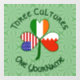 Shamrock features a different flag in each leaf. The flags of Bahrain, Ireland and the United States of America are found in this shamrock, designed to celebrate St. Patrick's Day, 4th of July and Bahraini holidays. The background is of light green squiggly squares. Above the shamrock are the words THREE CULTURES. Below, ONE YOURNAME. Words are in dark green, Celtic style, circular letters. To personalise, add your name in the proper place. For a custom gift, add someone else's name.