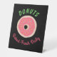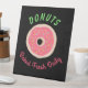 A cute pink doughnut with sprinkles and the text Doughnuts baked fresh daily in a fun faux neon font pairing with a white round border is perfect for small doughnut shops or just your own kitchen.