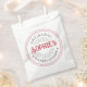 A bold baler's logo in the round, in red and white, for a baker, bakery, pastry chef or dessert caterer. Bold eye catching hand lettered type style. A perfect cookie bag, or for small baked items.