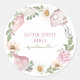 An elegant whimsical watercolor bakery pastry chef product labels with a pink and green coloured type and a cute baking utensils with floral round logo in the round. Personalise your name in a modern script signature type. The typography is in pastel hues and adds a whimsical touch of elegance and contrast. Add your contact information and social media information to the back of the card.