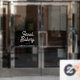 A white script business name branding window decal and window cling featuring business name and subtitle. A personalised shop window cling perfect for shop windows and front door signs. Perfect for a business shop owner who would like decorate their front door or window their business name and branding.