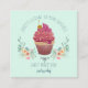 An artistic whimsical lovely watercolor cupcake logo in the round, pastel mint green background business card for a cupcake baker, bakery, dessert caterer. Unique hand lettered style curved type.