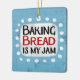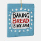 "Baking Bread Is My Jam" is a cute text design in blue with black and red text, along with a white accent shape and white textured whimsical dots surrounding it.