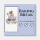 Modern illustration of woman in white frame on pastel blue background, taking a break from her baking. She's enjoying a glass of wine with her cookbook at her knee and following breadcrumbs on her cell phone. Her kitty cat is also having a nice relaxing time. "Baking Break" written in bold black font above a checklist of all the baking she has completed: Cake, Muffins and Bread. She sure deserves a break!