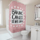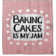 "Baking Cakes Is My Jam" is a cute text design in pink with black text, along with a white accent shape and white textured whimsical dots surrounding it.