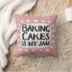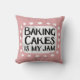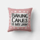 "Baking Cakes Is My Jam" is a cute text design in pink with black text, along with a white accent shape and white textured whimsical dots surrounding it.