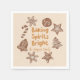 Festive and whimsical Christmas theme napkin for your holiday party featuring hand drawn illustration of holiday cookies. The text says "baking spirits bright."