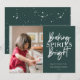 Modern white typography, "Baking Spirits Bright", photo holiday card in festive hunter green colour. Back of card features white splatter pattern in matching green background.