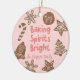 Fun and whimsical Christmas ornament featuring hand drawn illustration of holiday cookies. The text says "baking spirits bright."