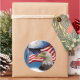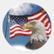 Shown is an image of the U.S. flag and a proud profile of a bald eagle.