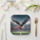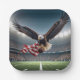 A bald eagle soars over a football field, clutching a ball and an American flag, creating a dramatic scene that symbolises patriotism