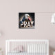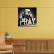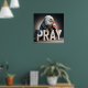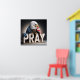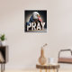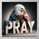 A majestic bald eagle is draped in an American flag, perched above large wooden letters spelling "PRAY."