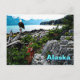 A digital painting of a bald eagle perched on a driftwood log washed up on the rock-strewn coast of Alaska; mountains loom in the distance. Text reading "Alaska" also appears.
