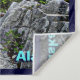 A digital painting of a bald eagle perched on a driftwood log washed up on the rock-strewn coast of Alaska; mountains loom in the distance. Customisable text reading "Alaska" also appears.