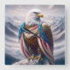 Bald eagle draped in an American flag with a tear in its eye perched on a mountain peak.
