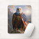 A majestic bald eagle stands proudly on a mountain top, donning a flowing American flag as a cape, symbolizing the strength and freedom of America