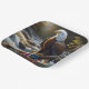 A majestic bald eagle is perched on a sturdy branch over a rocky creek with flowing water with an American flag